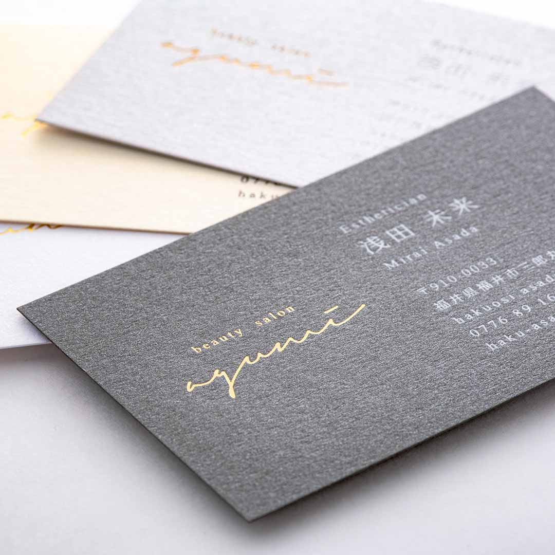左右で違う色の箔で加工しており、目を惹く仕上がりが人気のデザイン。2色箔押しはより高級感が感じられます。他とは違う、特別な名刺をご希望の方におすすめです。紙✕箔の組み合わせは最もおすすめのものをご提案しています。