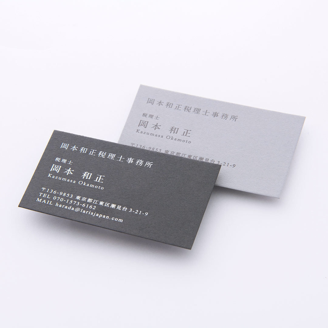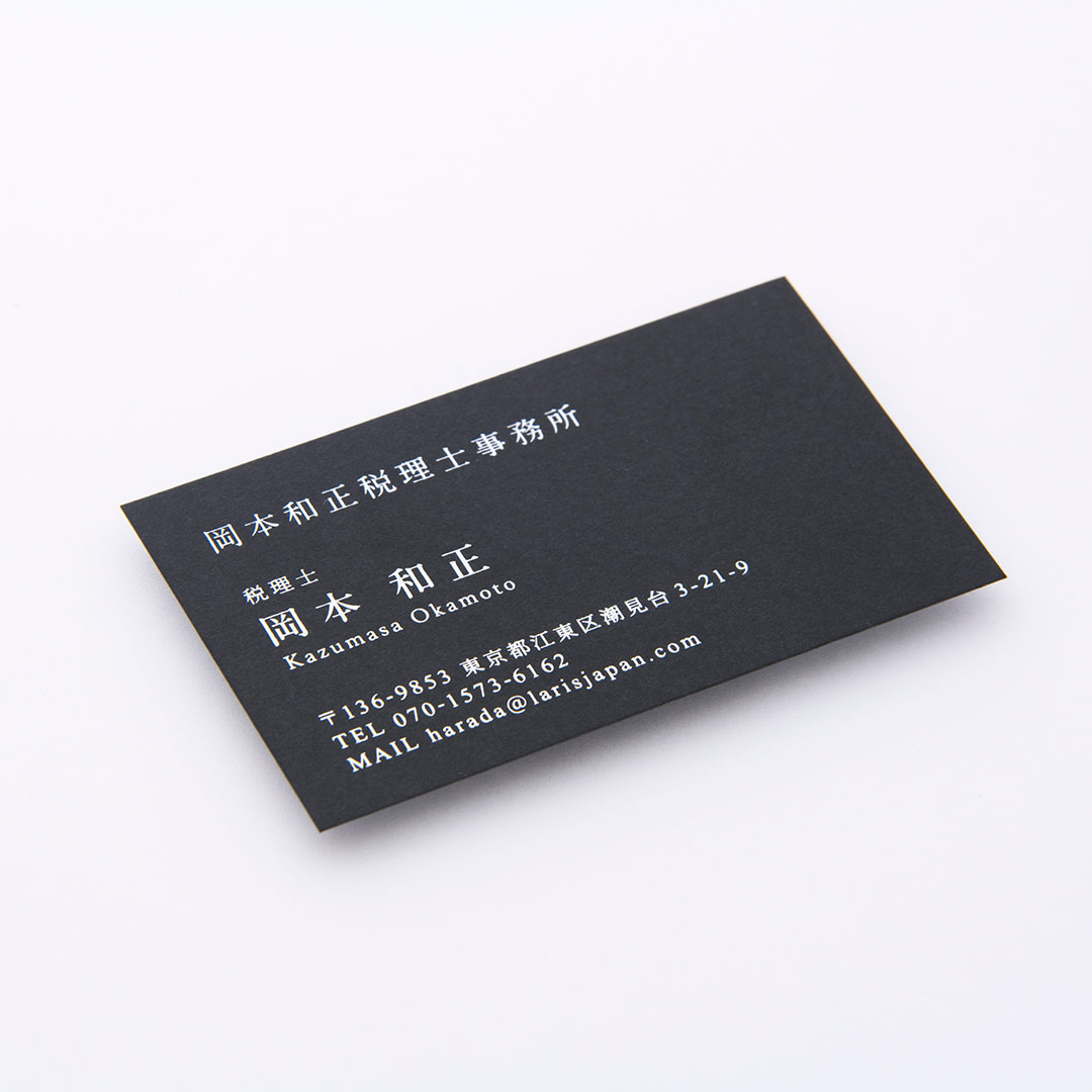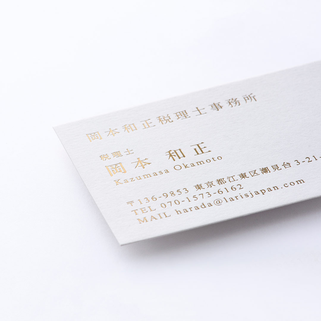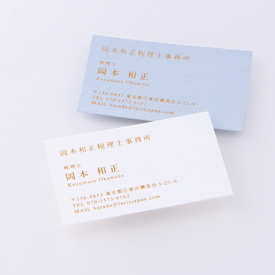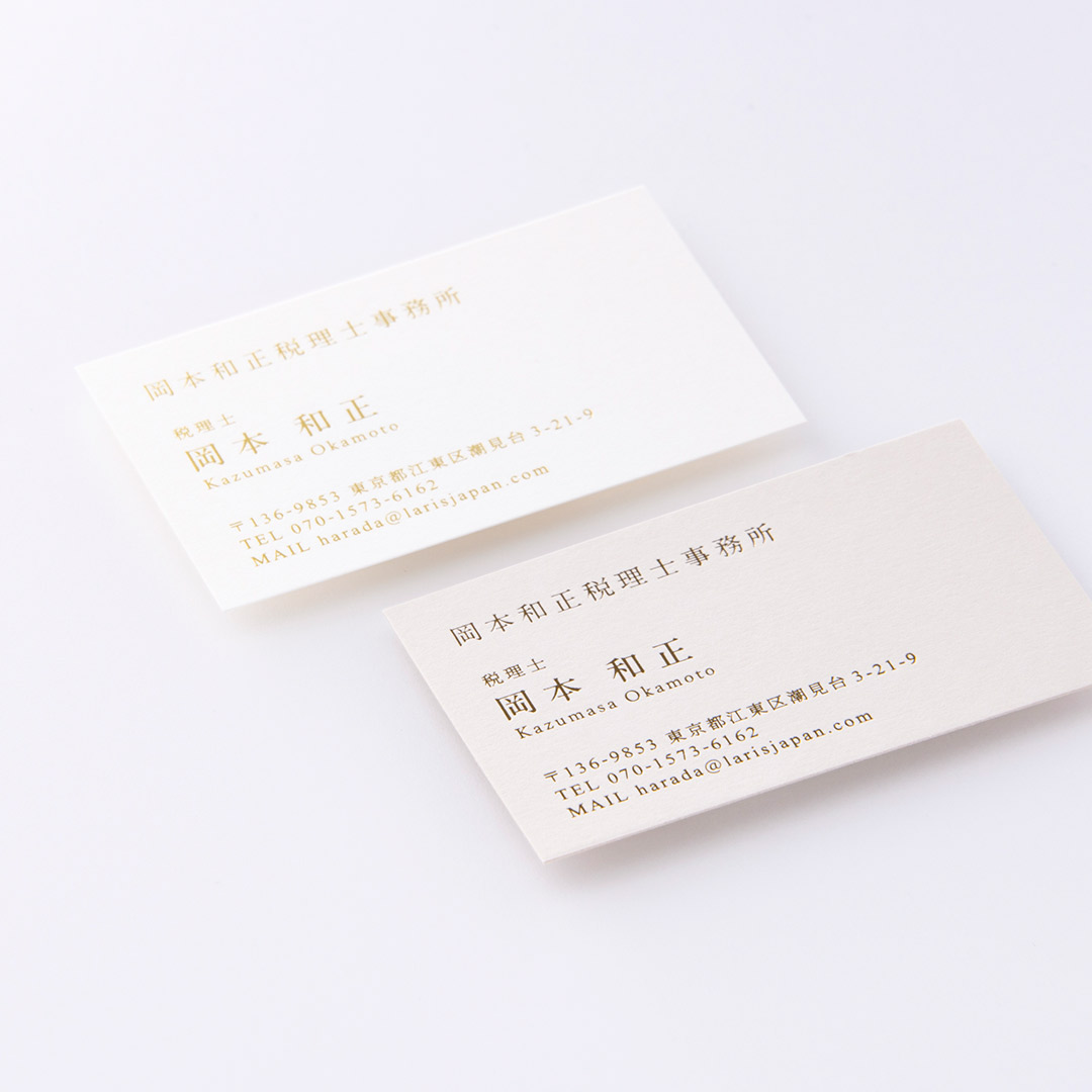 すっきりとしたシンプルな名刺。スタンダードなデザインですが、箔押し加工することで高級感と華やかさ、そして特別感がでます。「信頼感」を大切にしている業種の方に選ばれています。