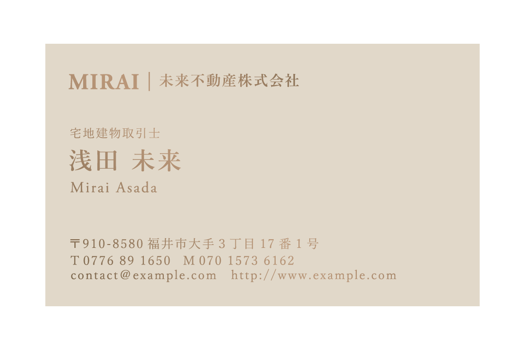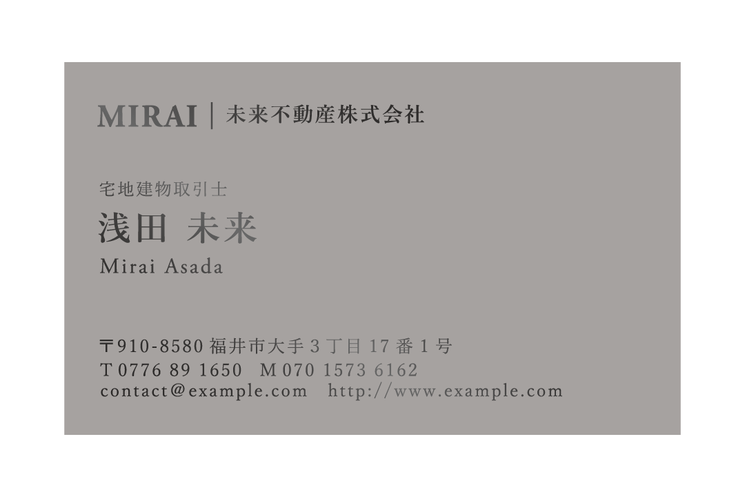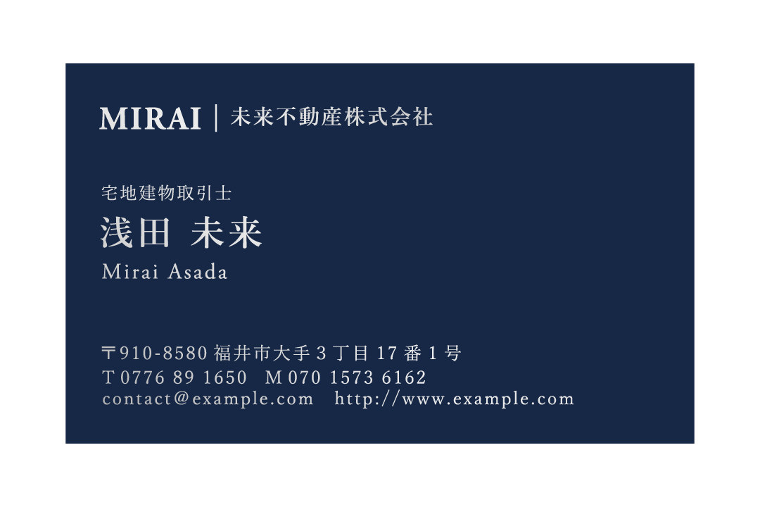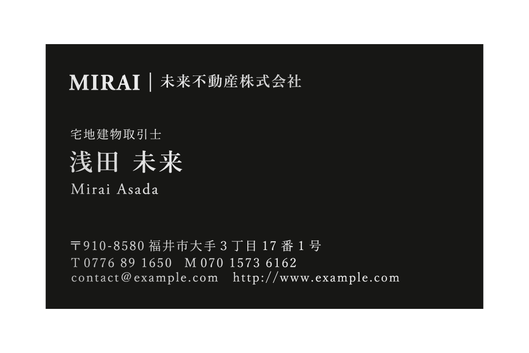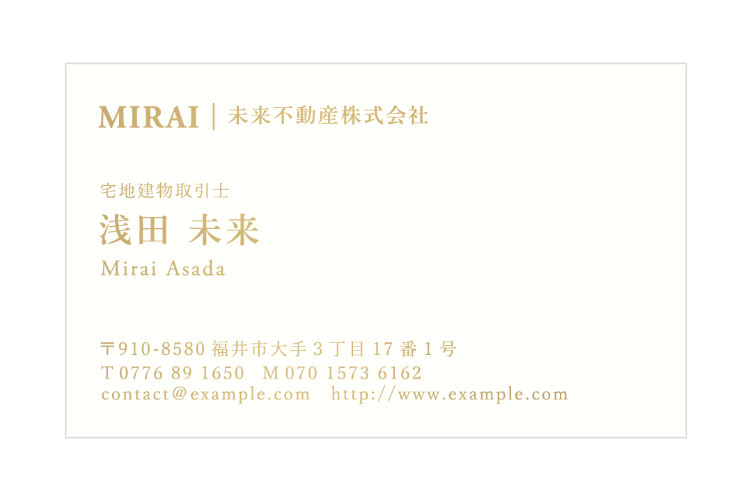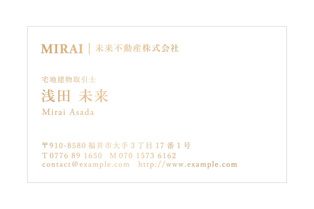 すっきりとしたシンプルな名刺。スタンダードなデザインですが、箔押し加工することで高級感と華やかさ、そして特別感がでます。「信頼感」を大切にしている業種の方に選ばれています。