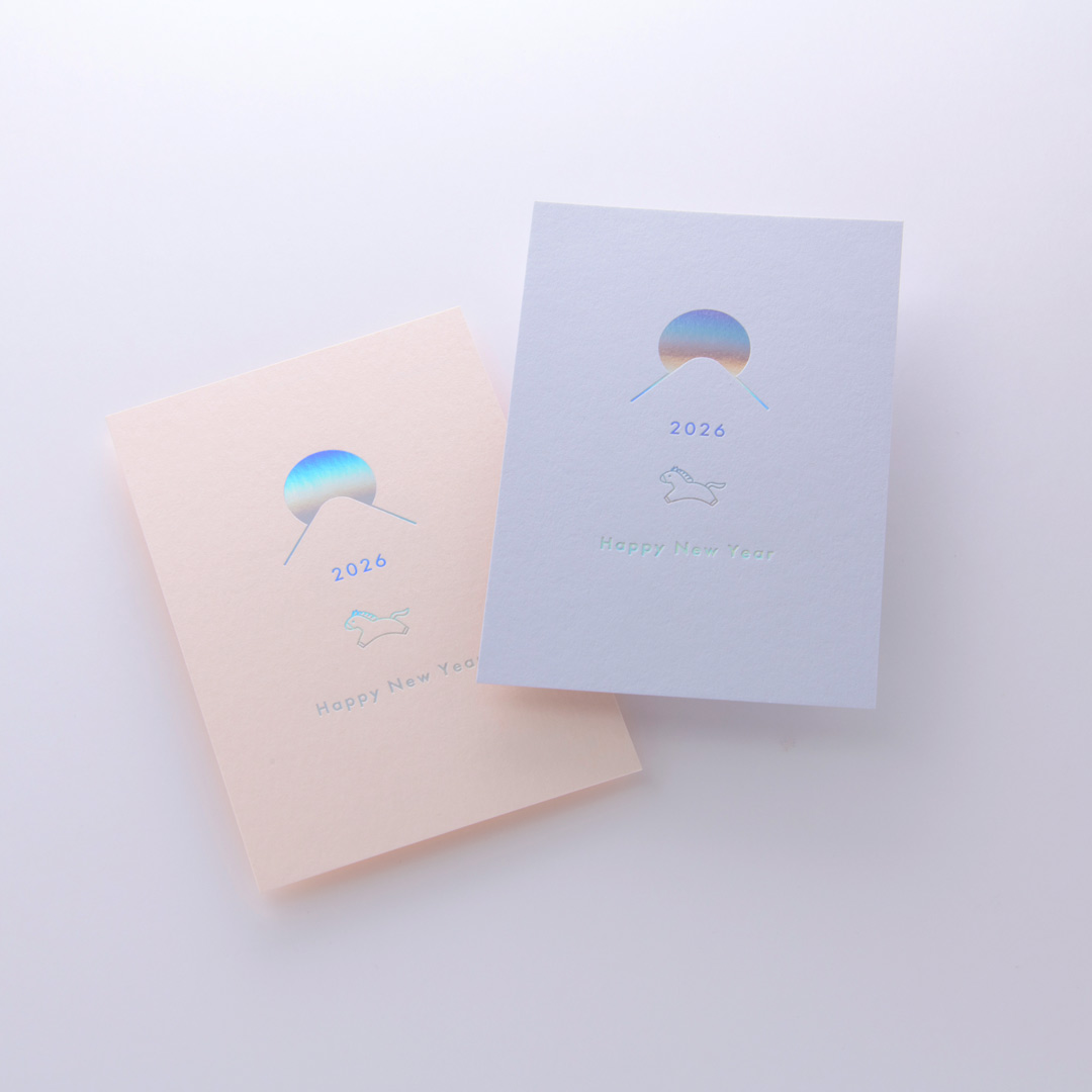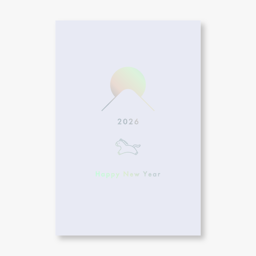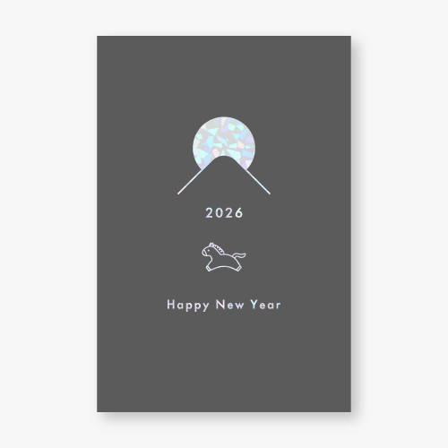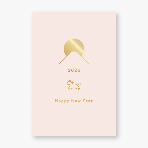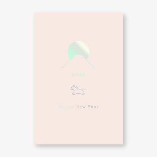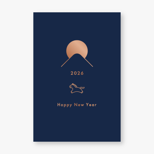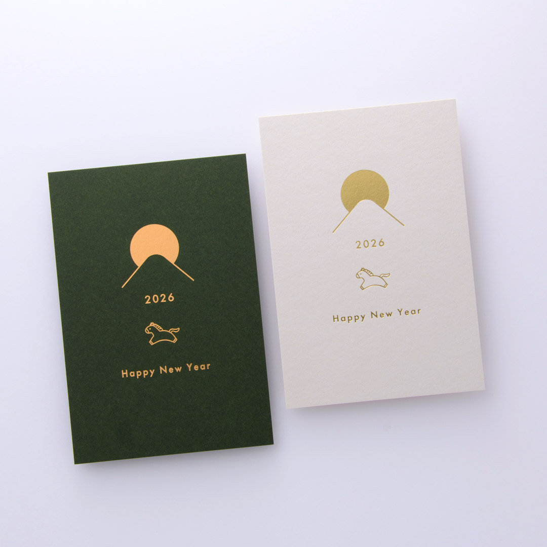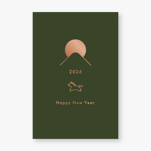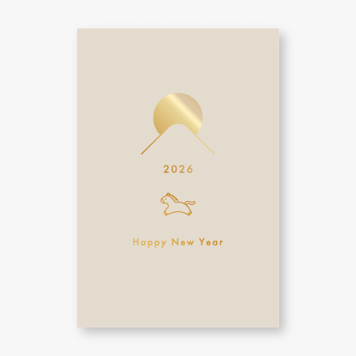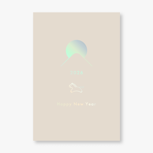 まるとさんかくで描いた、シンプルで美しい富士山。そこに、今年の干支「午」がのびやかに駆ける姿を添えました。