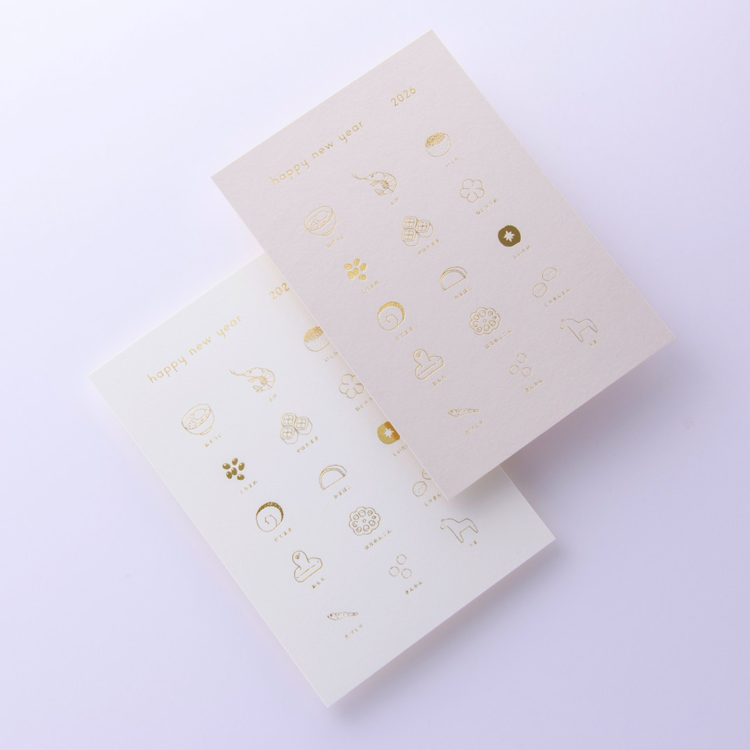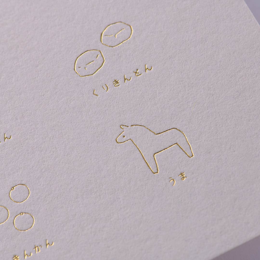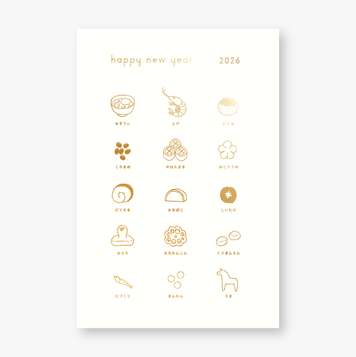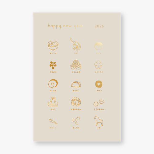 お子さまと一緒に「これはなあに?」と会話を楽しめる、世代をつなぐ年賀状。懐かしさの中に、ほっと心が和む温もりが広がります。金箔の上品な輝きが、おせちのイラストをいっそう引き立て、思わず飾っておきたくなる可愛らしさです。