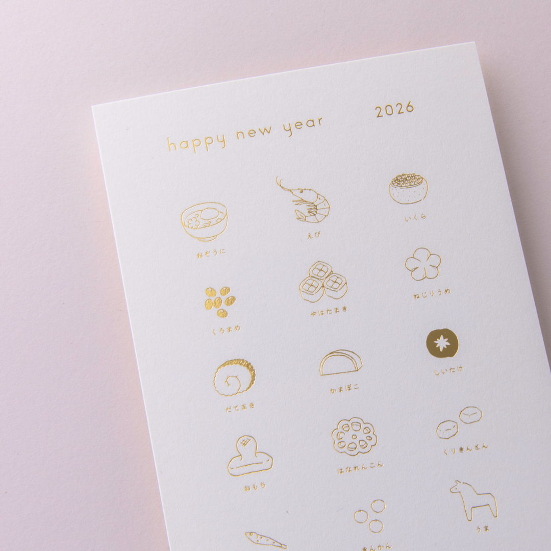 金箔がきらめく、おせち料理モチーフの華やかな年賀状。