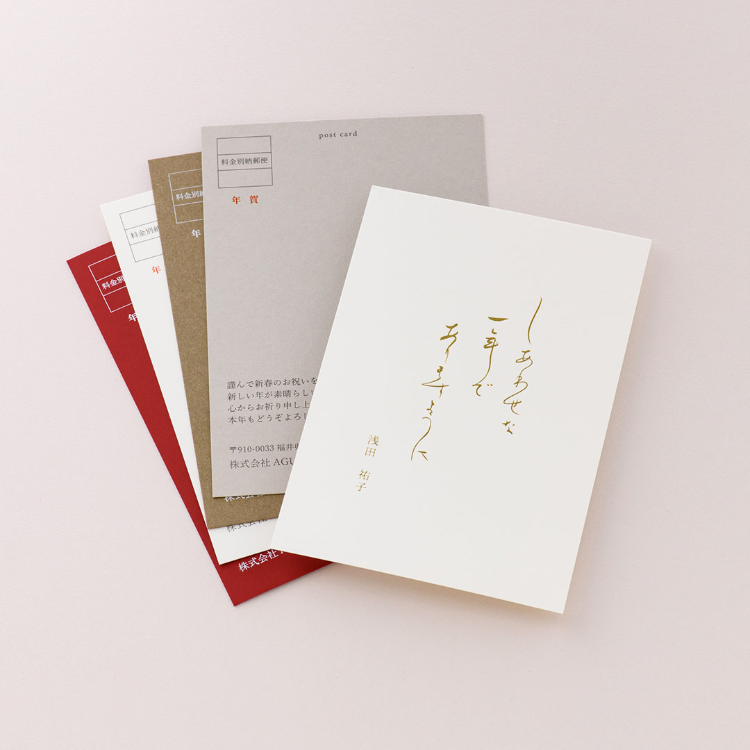 箔押し印刷専門店がお届けする「箔押し年賀状」。小ロット10部からご注文いただけます。箔押しの専門店だからこそできる、質の高さと低価格。新年のご挨拶にふさわしい、箔のついた印象に残る年賀状をどうぞ。