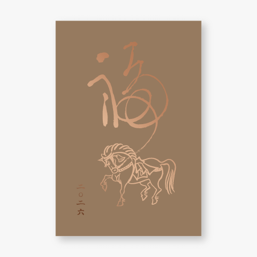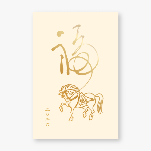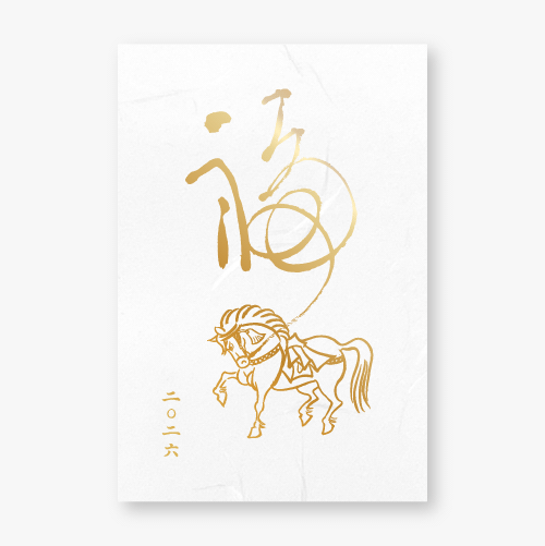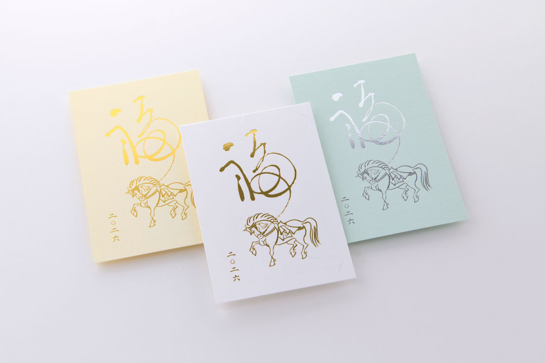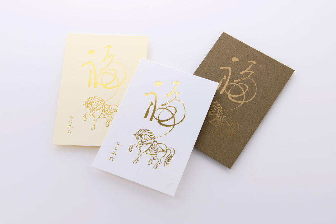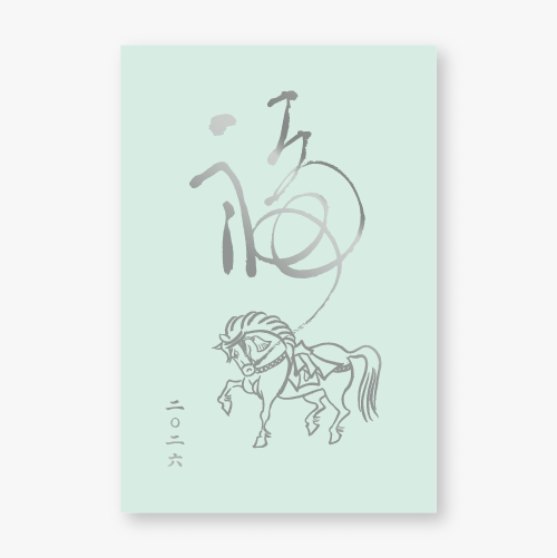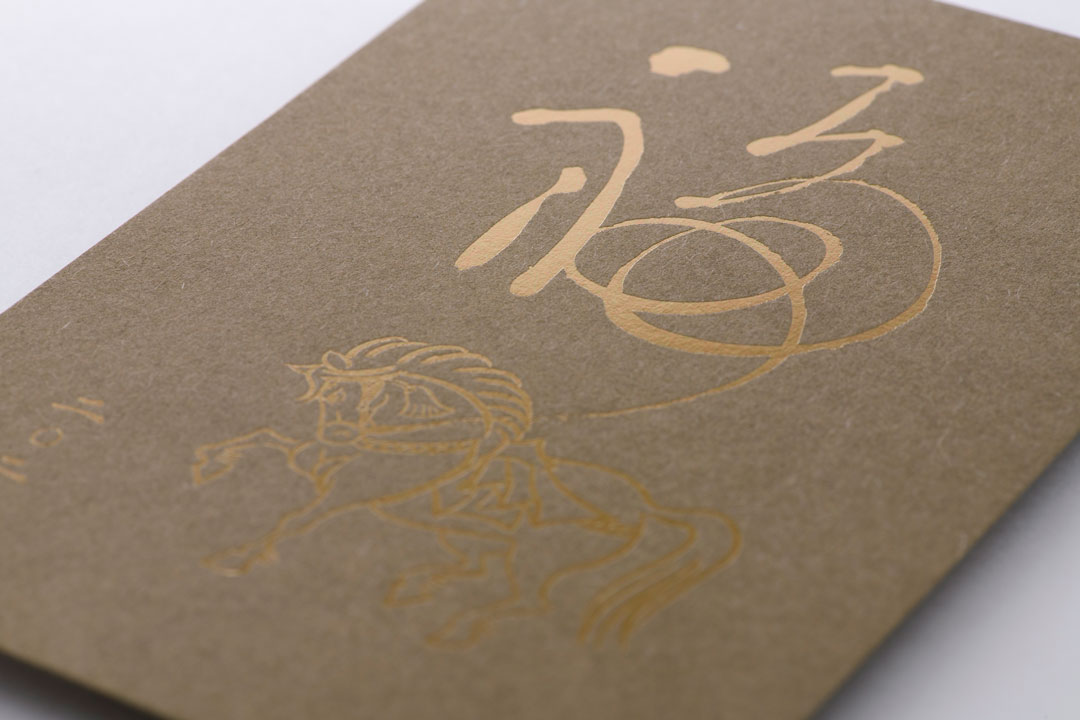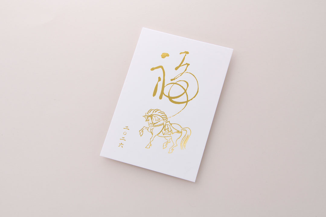 新しい年を告げるにふさわしい、縁起の良い「神馬」を箔押しであしらった特別な年賀状。神馬は古来より、天へと駆け昇り、幸運・勝利・発展を授ける象徴とされてきました。金が輝く箔の煌めきは、その縁起の良さをさらに高め、大切な方へ「良き一年を願う心」を華やかに伝えます