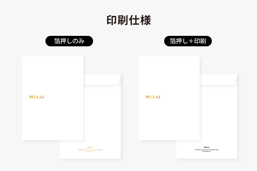 箔押しだけでなく、モノクロ印刷・白印刷のみの印刷も対応可。
