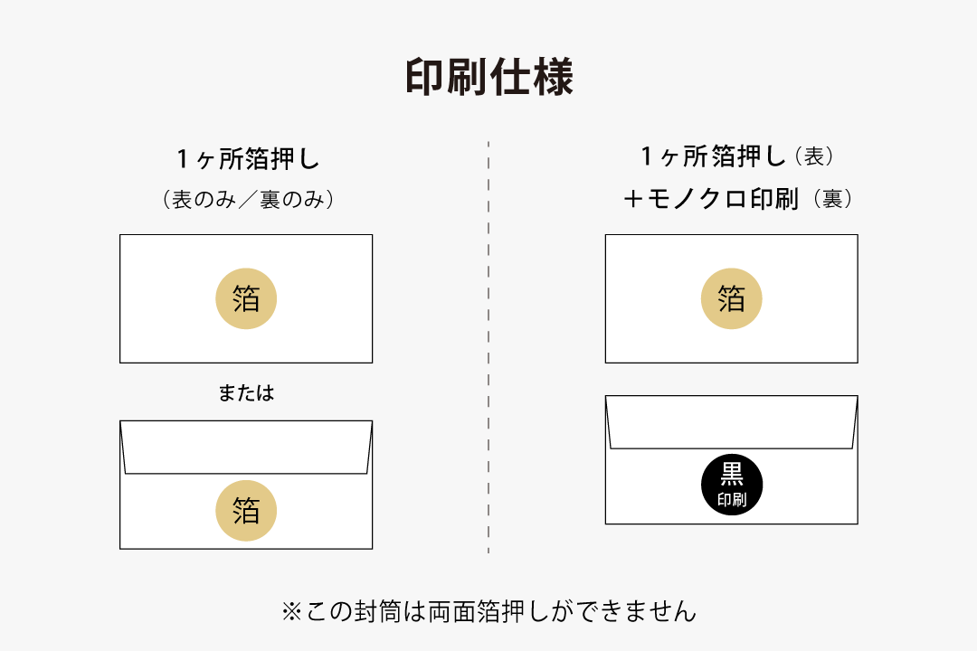 • ご覧になっている封筒紙色は、箔押しは片面のみ可能。両面に箔押しはできません。