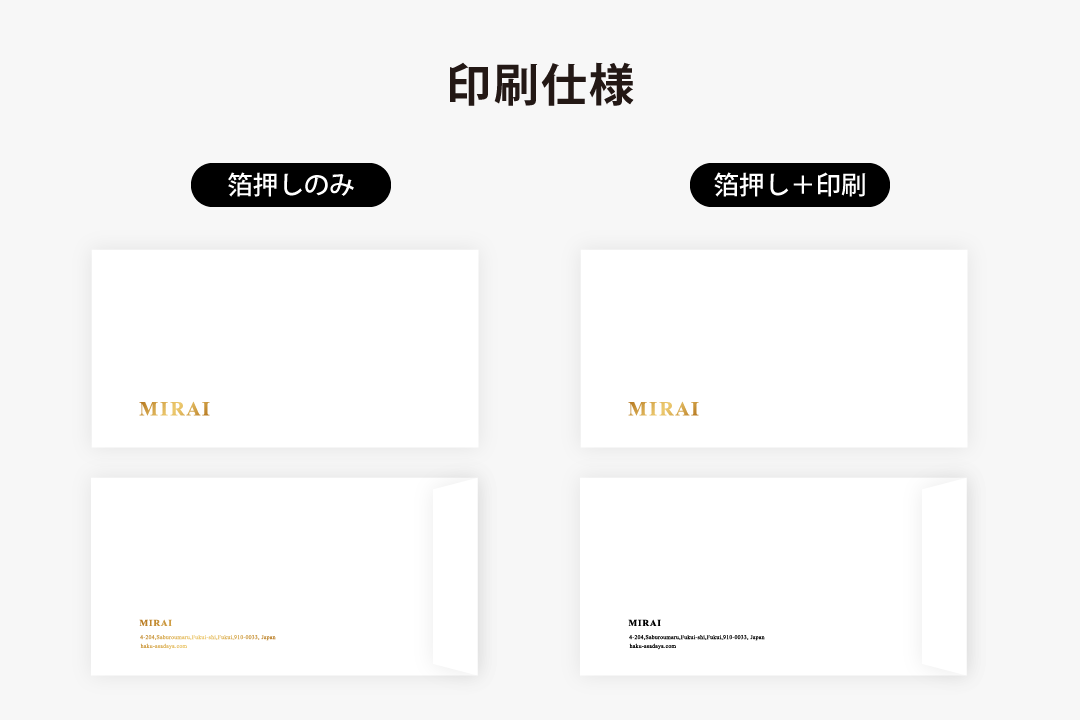 同じ面で複数の箔を使い分ける『複数箇所箔押し加工』も可能です。複数ヶ所箔押し加工の配色については、ご入稿いただくデザインデータにてご指定下さい。