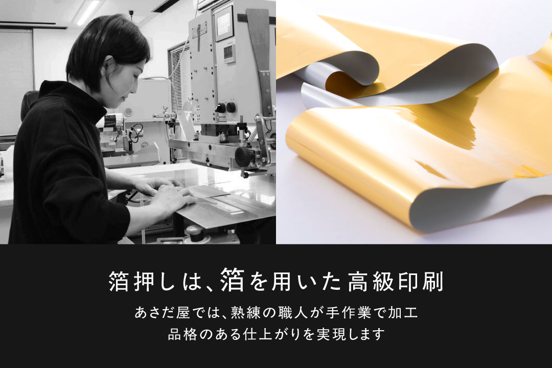 会社名や名前、ロゴを箔押しすることで、堅実で信頼感のある印象に。さりげない心配りが、好印象につながります。