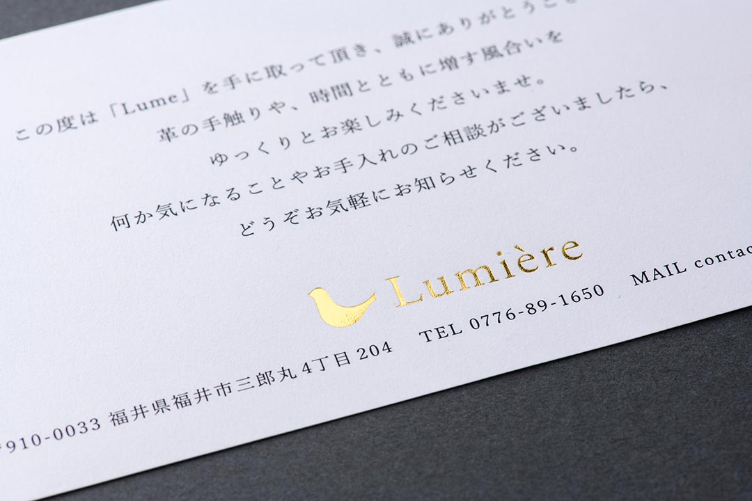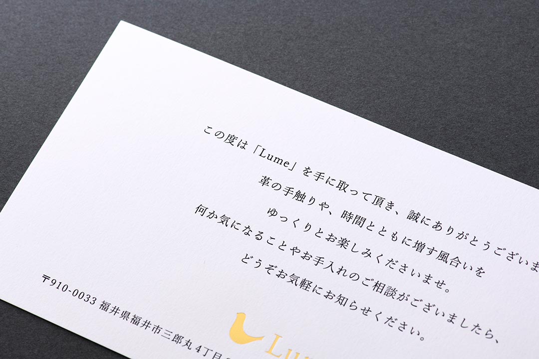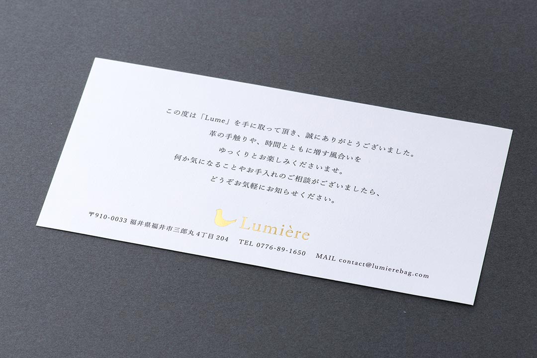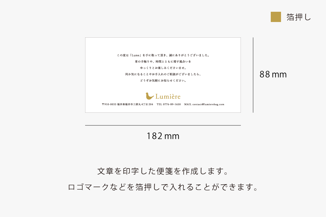 会社名や名前、ロゴを箔押しすることで、堅実で信頼感のある印象に。さりげない心配りが、好印象につながります。