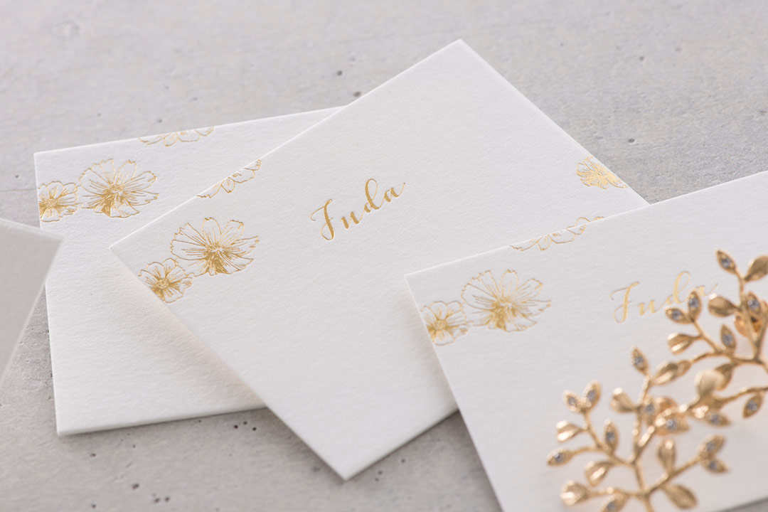 金箔・銀箔をはじめとしたらキラキラ輝く特殊印刷。デザインから金属版を作成し、職人が一枚一枚を手押しで加工。あさだ屋の箔押しは高級特殊紙(美しい紙)を中心にセレクトしています。