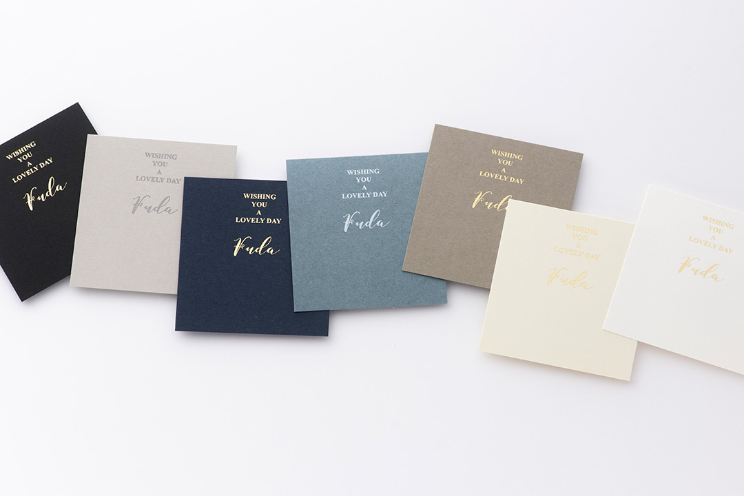 金箔・銀箔をはじめとしたらキラキラ輝く特殊印刷。デザインから金属版を作成し、職人が一枚一枚を手押しで加工。あさだ屋の箔押しは高級特殊紙(美しい紙)を中心にセレクトしています。