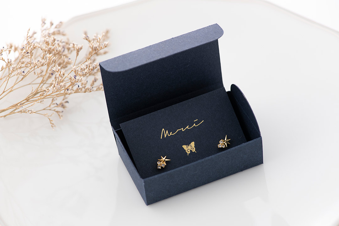 細長くスリムな形の小箱は、指輪やイヤリングなどの小物を収めるギフトボックスにおすすめです。