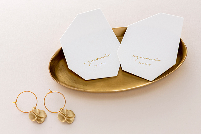 箔押しのみ・印刷のみだけでなく、印刷+箔押しの組み合わせも可能です。オリジナルトムソン版を作成すれば、ピアス孔や切り込み加工なども指定位置で対応できます。
