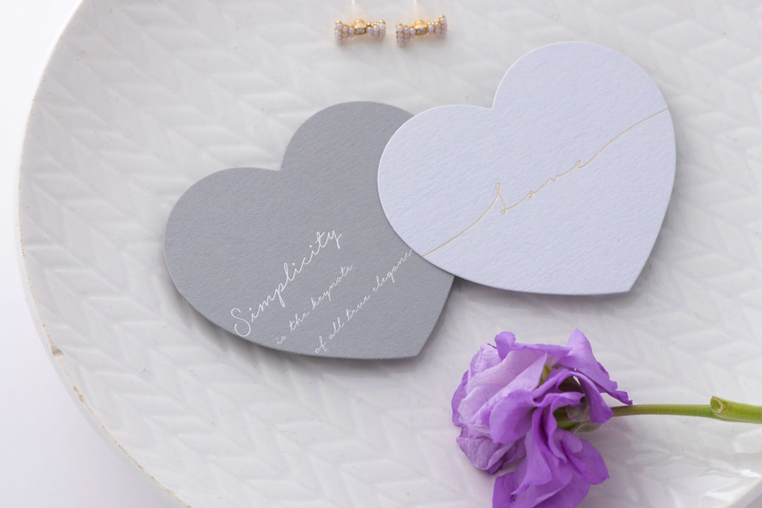 金箔・銀箔をはじめとしたらキラキラ輝く特殊印刷。デザインから金属版を作成し、職人が一枚一枚を手押しで加工。あさだ屋の箔押しは高級特殊紙(美しい紙)を中心にセレクトしています。