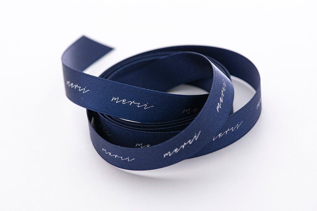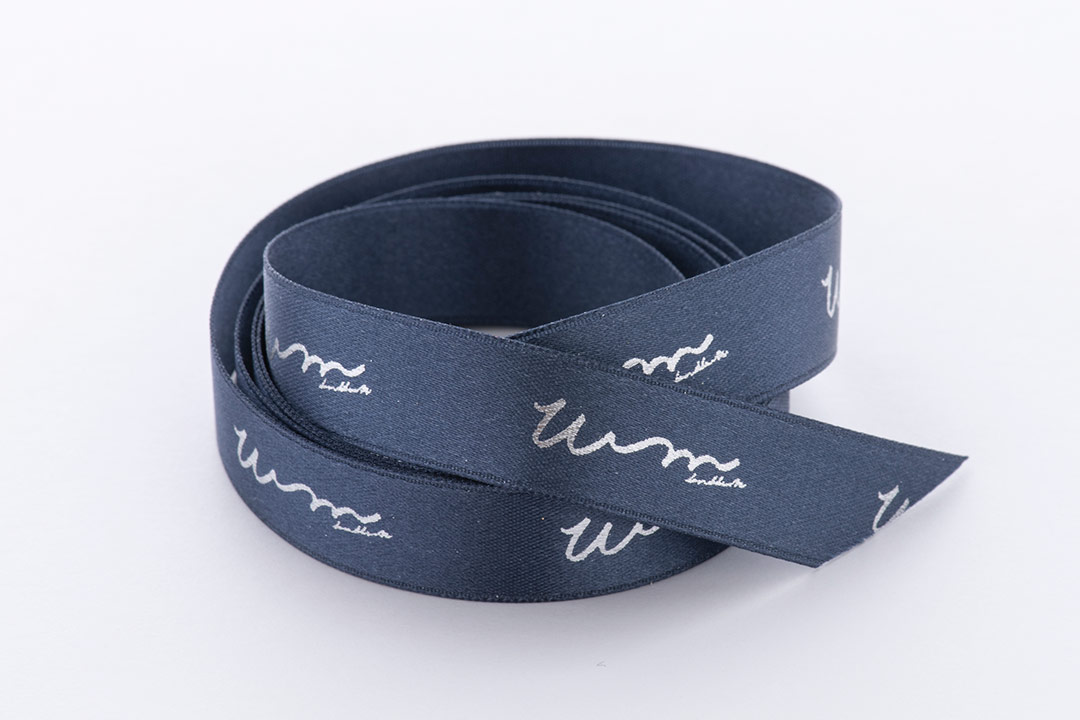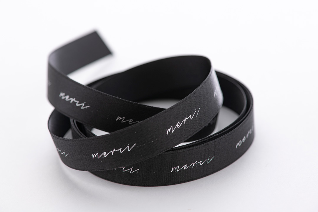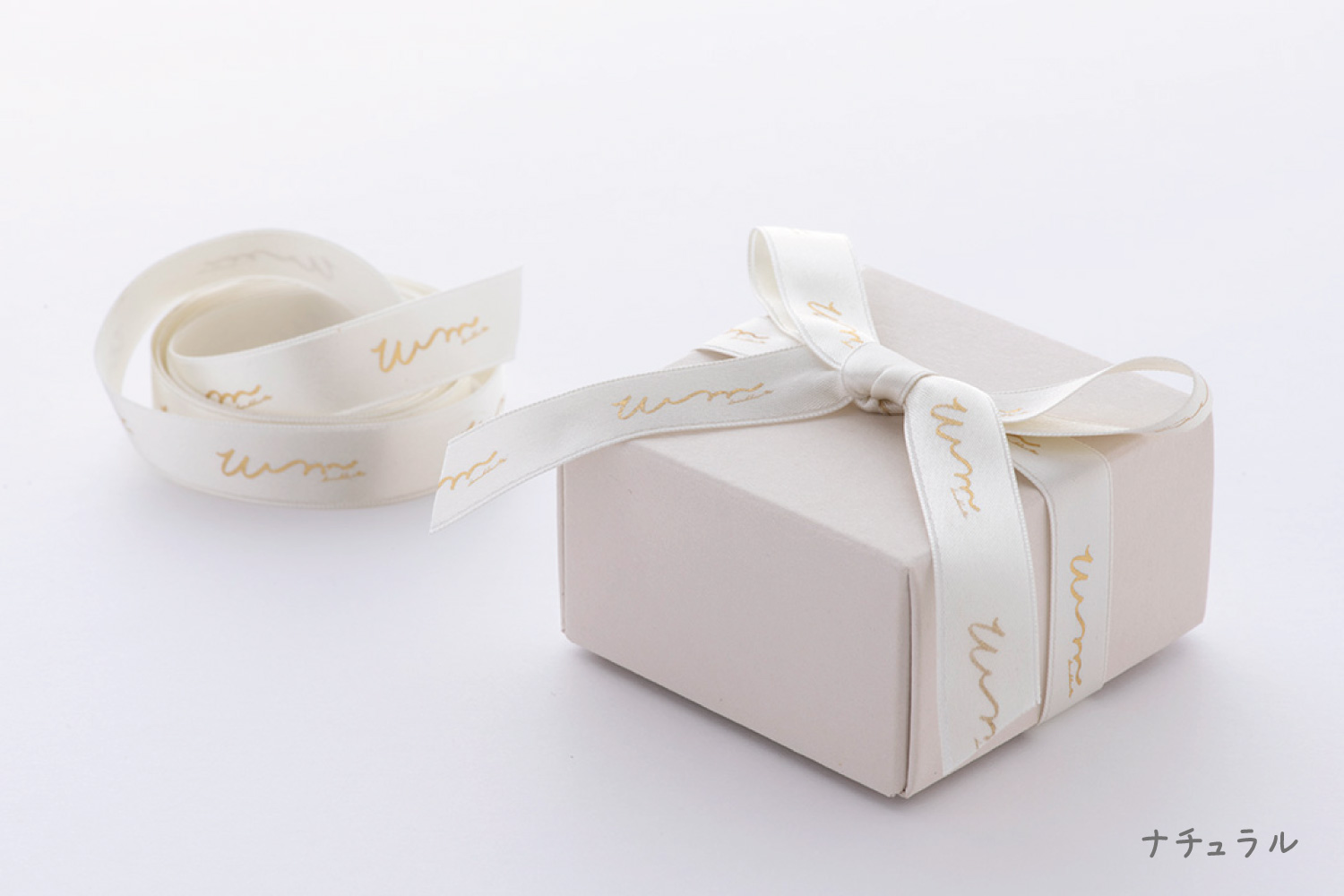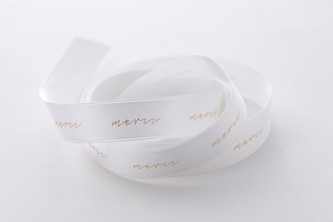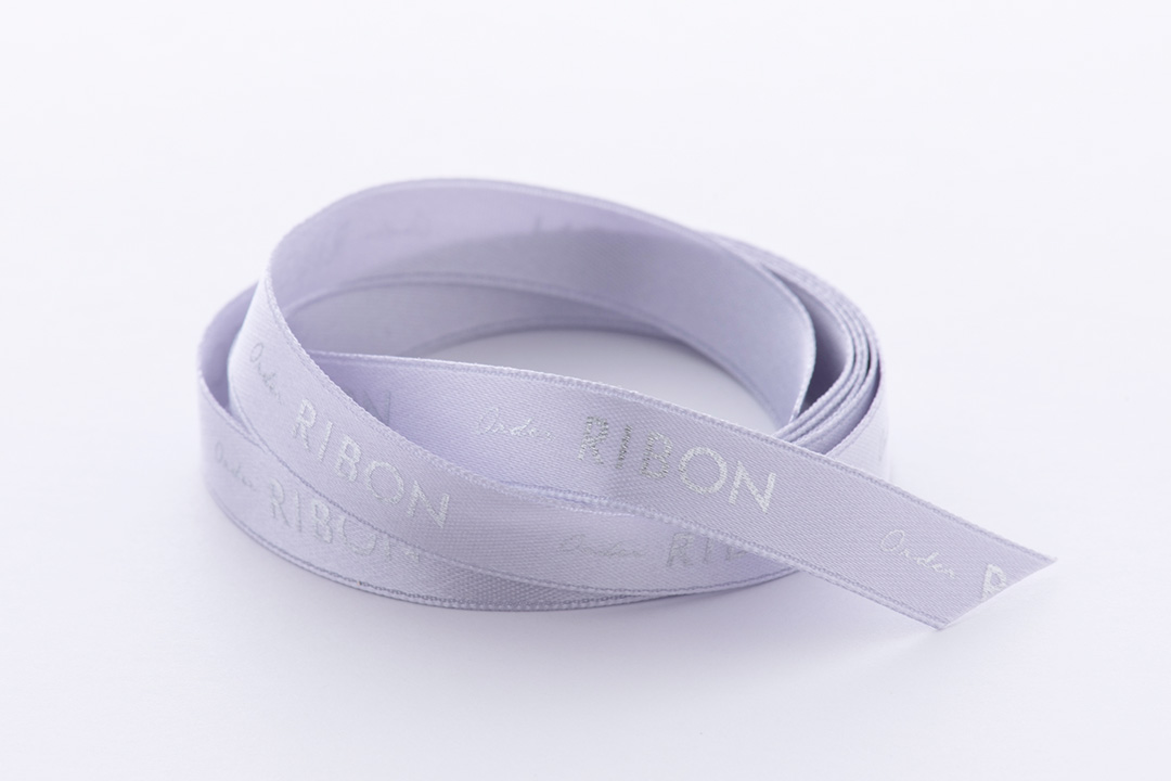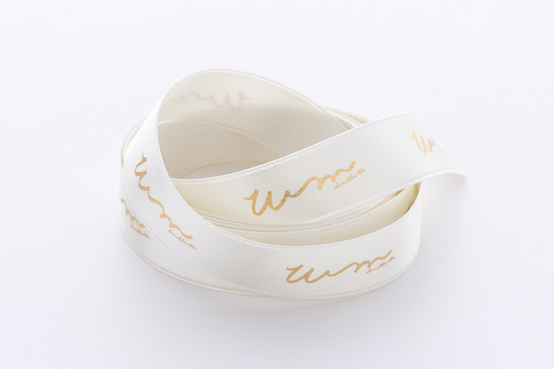 ロゴや文字を入れて、ブランドリボンを簡単にお作りいただけます。上品な光沢となめらかな質感が美しい高級サテンリボンを使用。そこに金箔・銀箔で名入れすることで、やさしく華やかな印象に仕上がります。