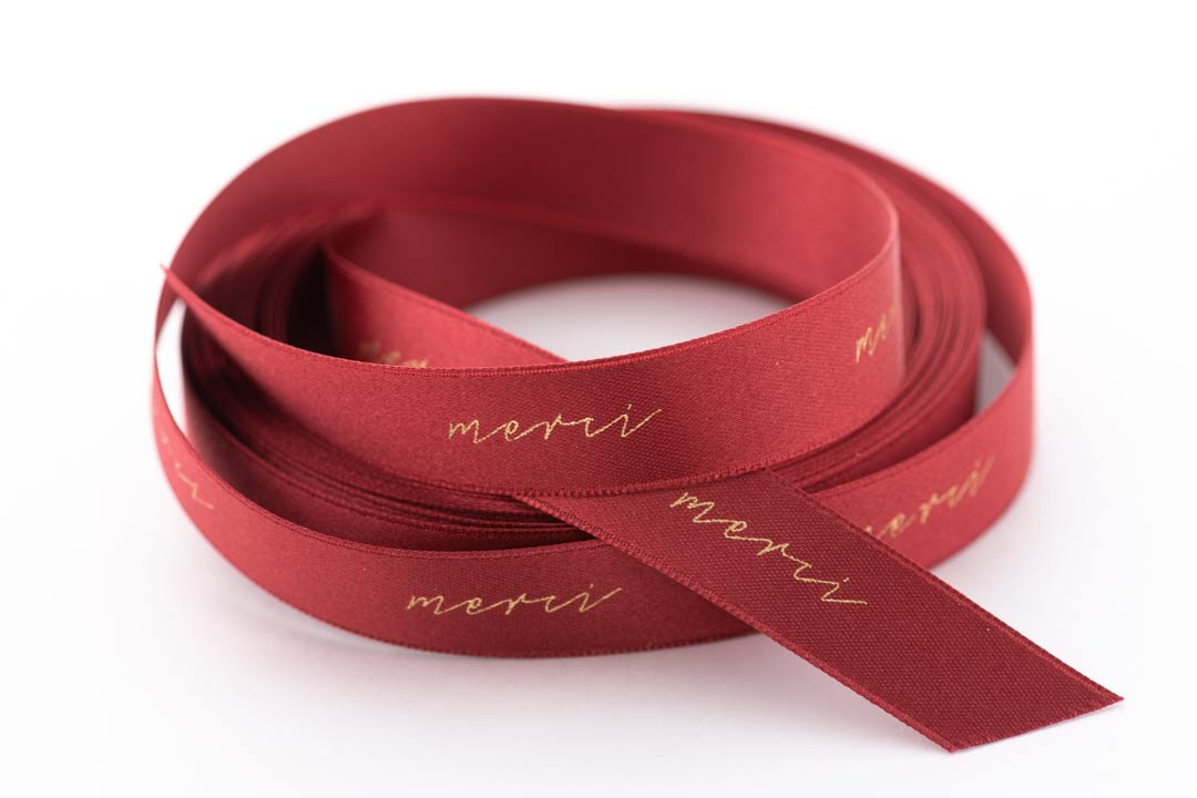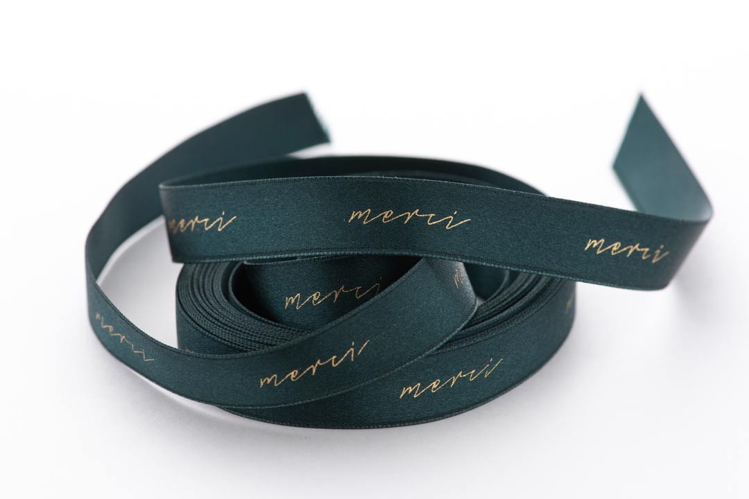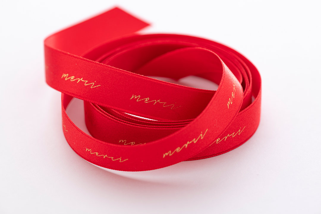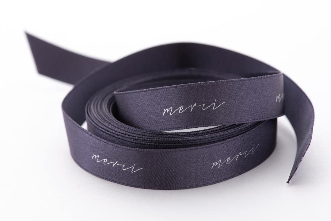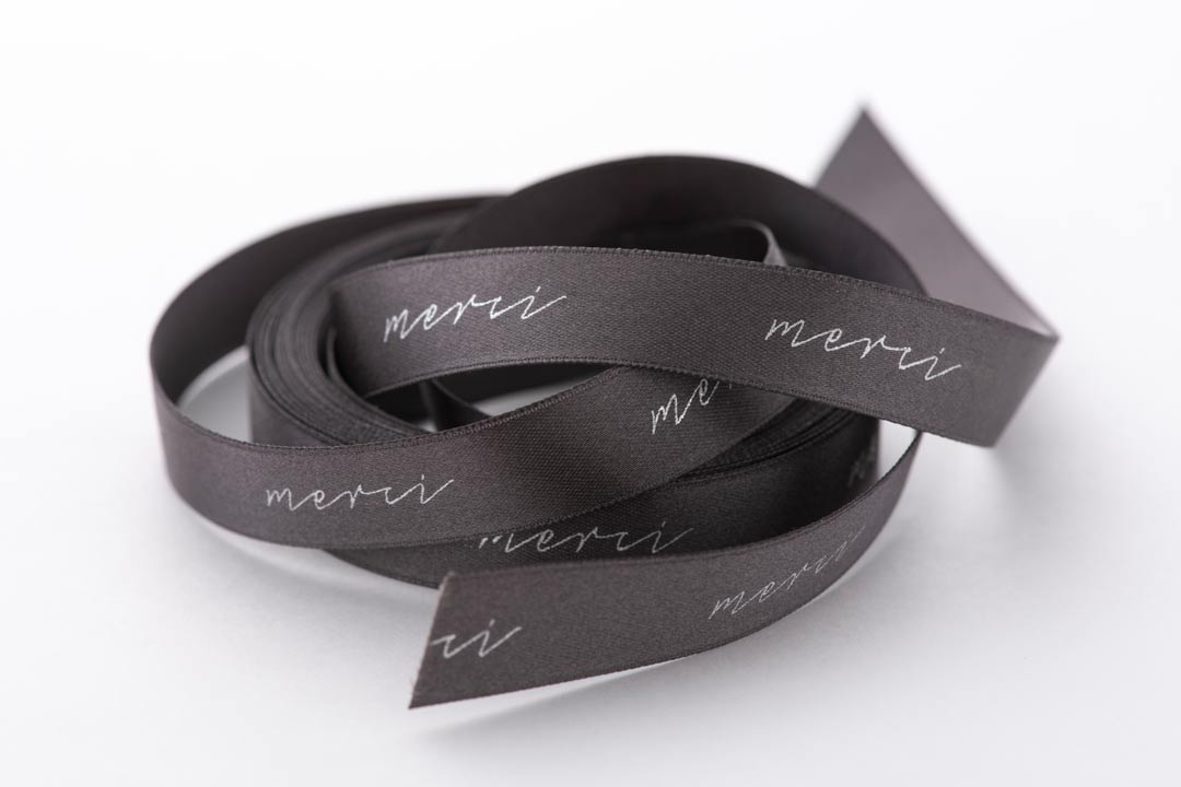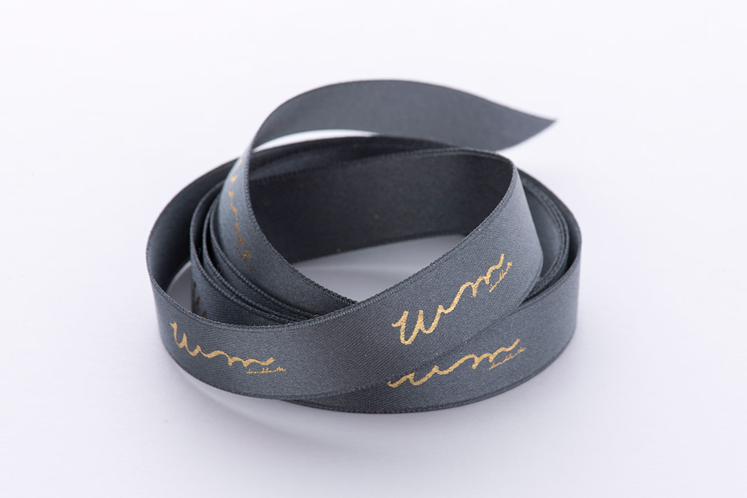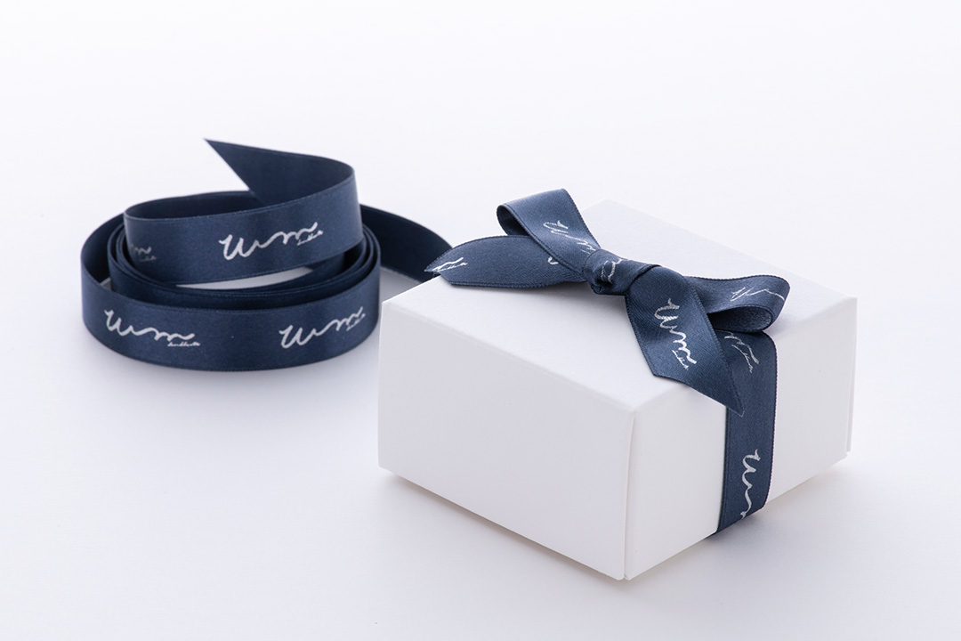 ロゴや文字を入れて、ブランドリボンを簡単にお作りいただけます。上品な光沢となめらかな質感が美しい高級サテンリボンを使用。そこに金箔・銀箔で名入れすることで、やさしく華やかな印象に仕上がります。