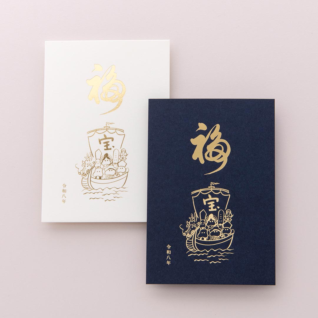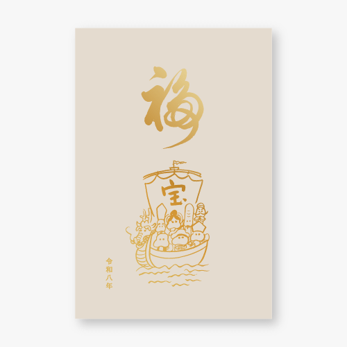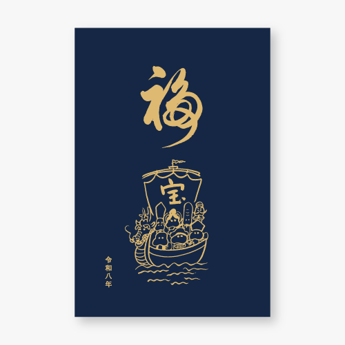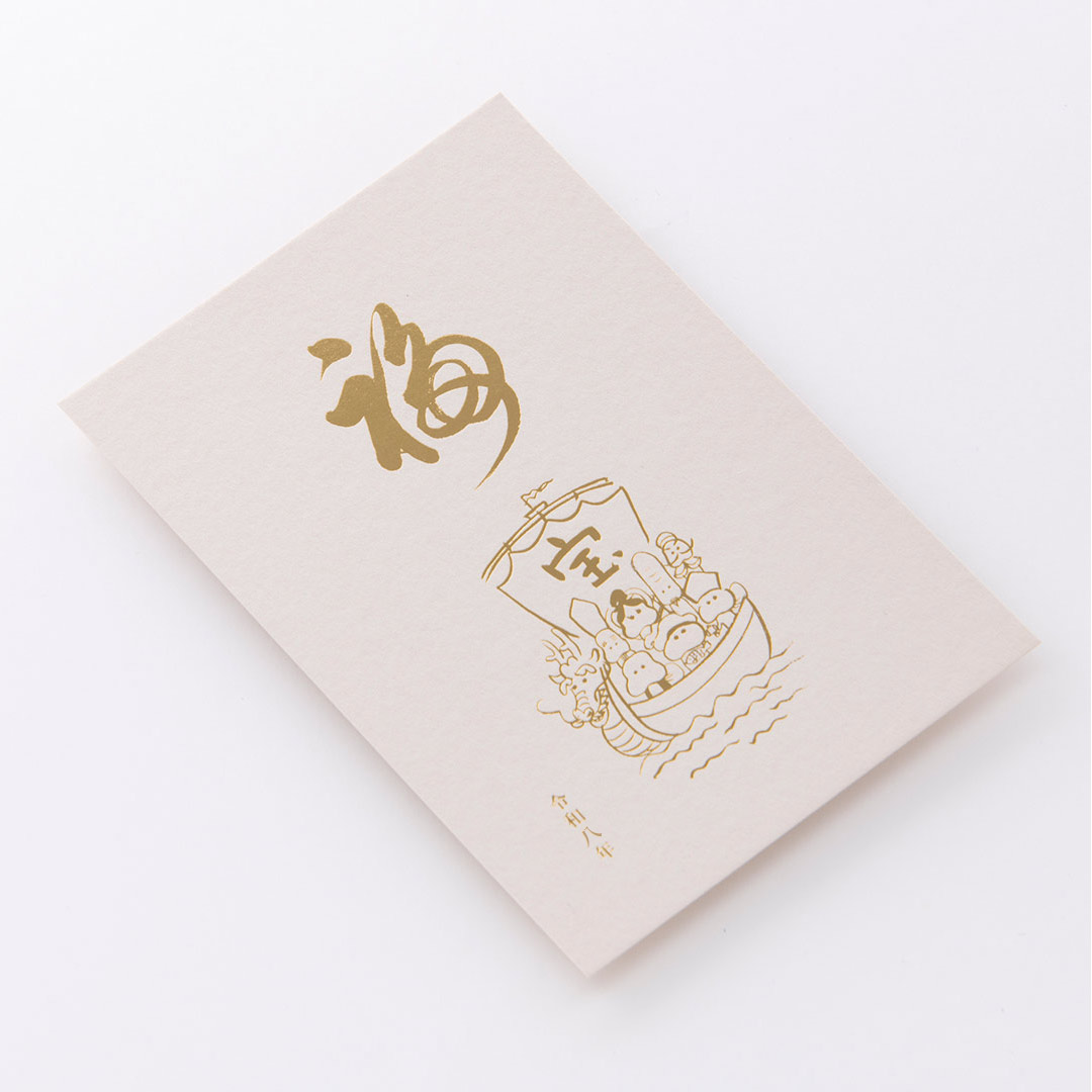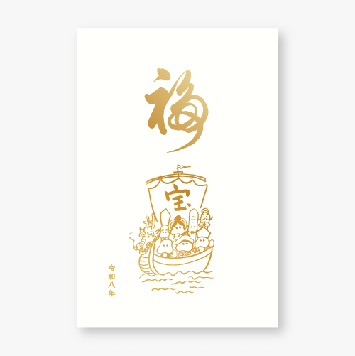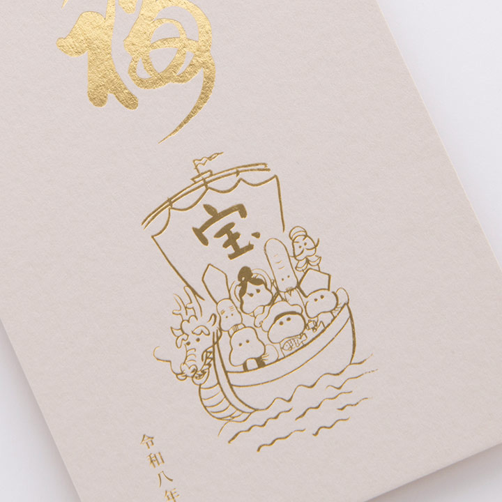 「福」を連れてやってくる、じっと見つめてくる七福神をのせた宝船。神様の表情を見ると、なんとも言えない愛らしいお顔。なにかじわじわと笑いが込み上げる・・・たまらない年賀状です。昔ながらの七福神も良いですが、こんなに可愛い七福神は見たこともなく喜ばれることでしょう。箔押し印刷で加工してあることから、新年からハクがつくと、さらに縁起が良くなります。